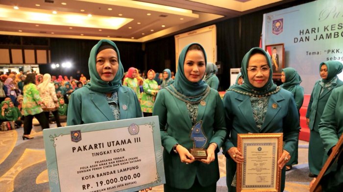 Alhamdulillah, pada Hari Kesatuan Gerak PKK kali ini, Lampung kembali memperoleh penghargaan, yakni Pakarti Madya III Tingkat Kota untuk Kota Bandar Lampung sebagai Pelaksana Terbaik Pola Asuh Anak dan Remaja (PAAR) Dengan Penuh Cinta dan Kasih Sayang, Kemudian Pakarti Madya II Tingkat Kabupaten untuk Kabupaten Pesawaran sebagai Pelaksana Terbaik Pemanfaatan Pekarangan, dan Pakarti Madya I Tingkat Kota untuk Kota Metro sebagai Pelaksana Terbaik Inspeksi Visual Asam Asetat (IVA) Test,” kata istri Gubernur termuda tersebut.