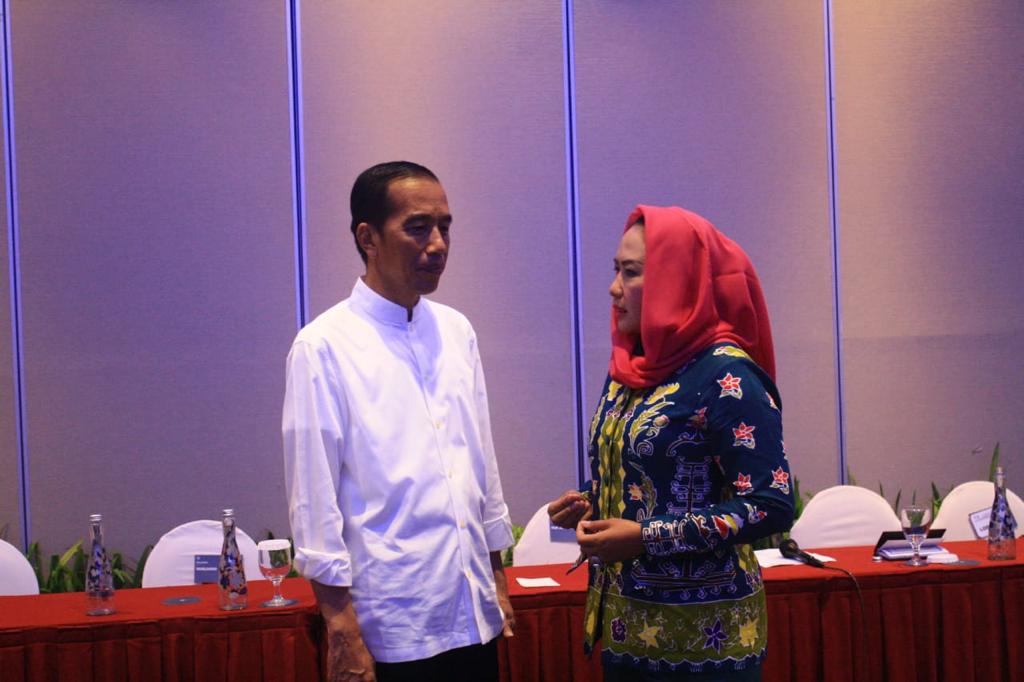 Bunda Winarti, sapaan akrab Bupati Tulangbawang memanfaatkan temu Presiden dengan menyampaikan progres pembangunan dan aspirasi masyarakat di Tulangbawang.