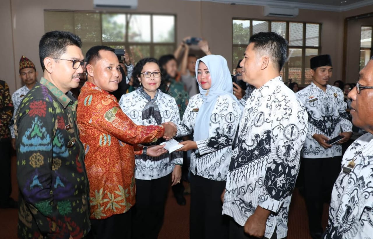 Secara simbolis bantuan diserahkan Ketua Umum PB PGRI Dr. Unifah Rosyidi, M.Pd didampingi Pelaksana Tugas (Plt) Bupati Lamsel Nanang Ermanto, Sekretaris Daerah Kabupaten Lamsel Fredy SM, dan Kepala Dinas Pendidikan Lamsel Thomas Amrico, Aula Rajabasa, Kantor Bupati setempat, Kamis (31/1/2019).
