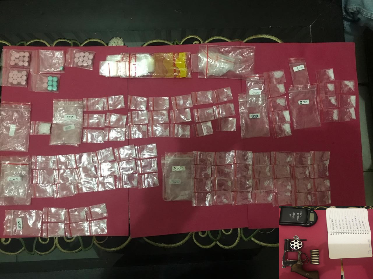 Dalam perkara ini, petugas melakukan penyitaan BB berupa 4 bungkus plastik klip yang berisi 32 butir pil inex warna merah muda berlogo NIKE dan enam butir pil inex warna biru muda tanpa logo, 1 bungkus plastik klip kecil berisi pecahan pil inex warna biru muda tanpa logo, 86 bungkus plastik klip kecil yang berisi narkotika jenis sabu dengan berat bruto sekira 13,24 gram, bungkus plastik klip yang berisi beberapa plastik klip kosong, bungkus plastik klip berisi beberapa plastik klip bekas sabu, timbangan digital merk CHQ warna hitam, senpi rakitan jenis revolver, 6 butir amunisi aktif call 38 mm modifikasi dan buku catatan jual beli narkotika.