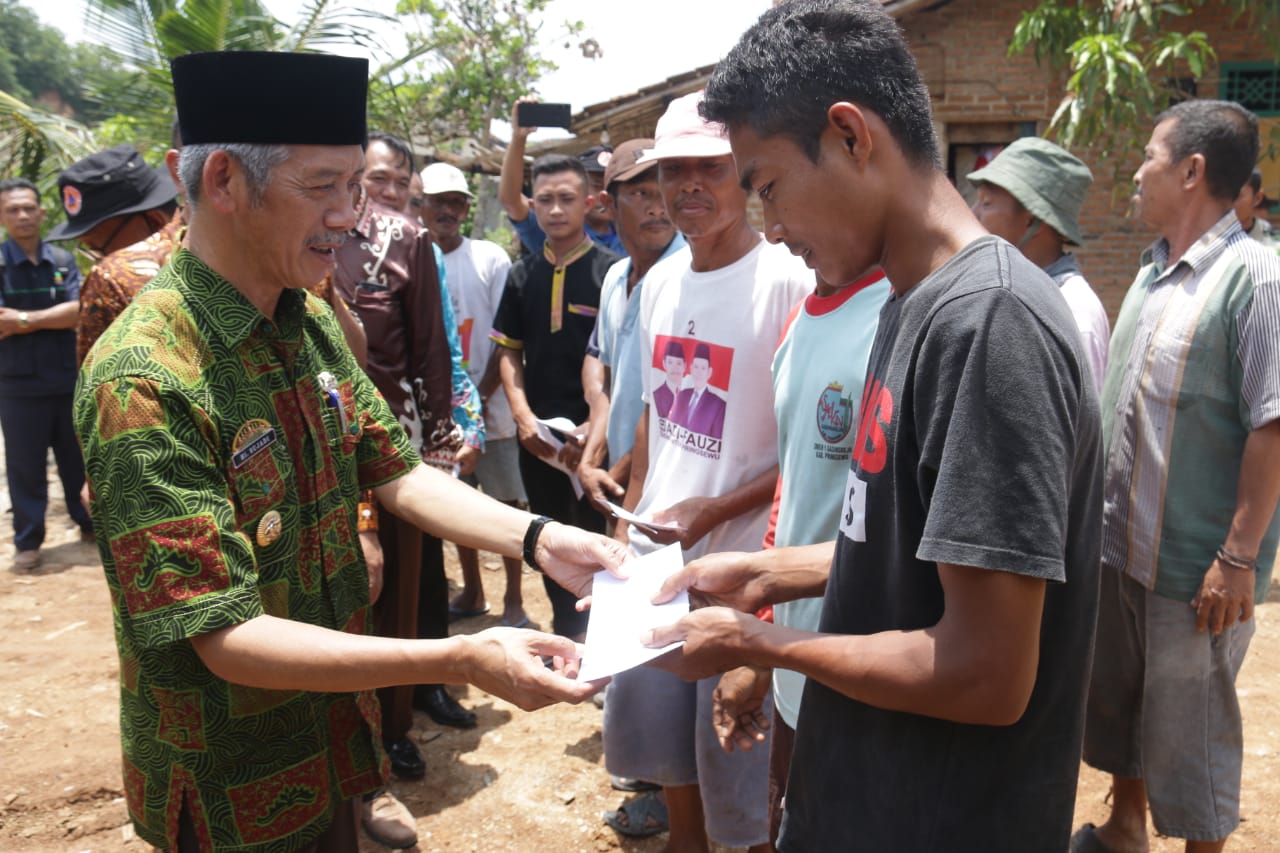 RAKYATNEWS.CO.ID,GADINGREJO – Bupati Pringsewu Hi. Sujadi menyerahkan bantuan kepada korban bencana alam puting beliung di Dusun Tambahsari, Pekon Tambahrejo Barat, Kecamatan Gadingrejo, Kamis (21/2). Bantuan berupa sembako dan material bangunan diterima oleh para korban terdampak angin puting beliung yang terjadi beberapa hari lalu di dusun setempat.