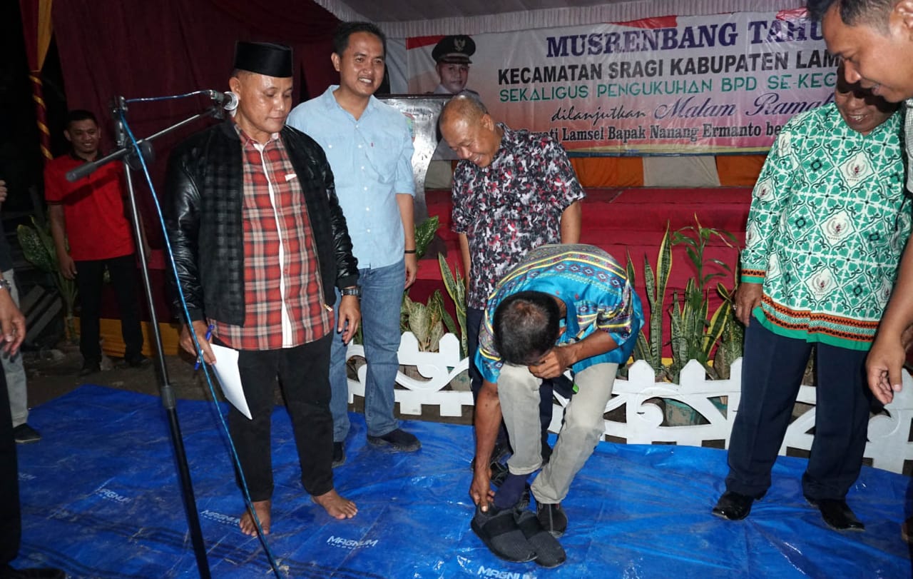 Tindakan Plt Bupati Lampung Selatan Nanang Ermanto dengan memberikan sepatu yang sedang dipakainya kepada salah seorang warga, mendapat apresiasi dari ratusan masyarakat yang hadir.