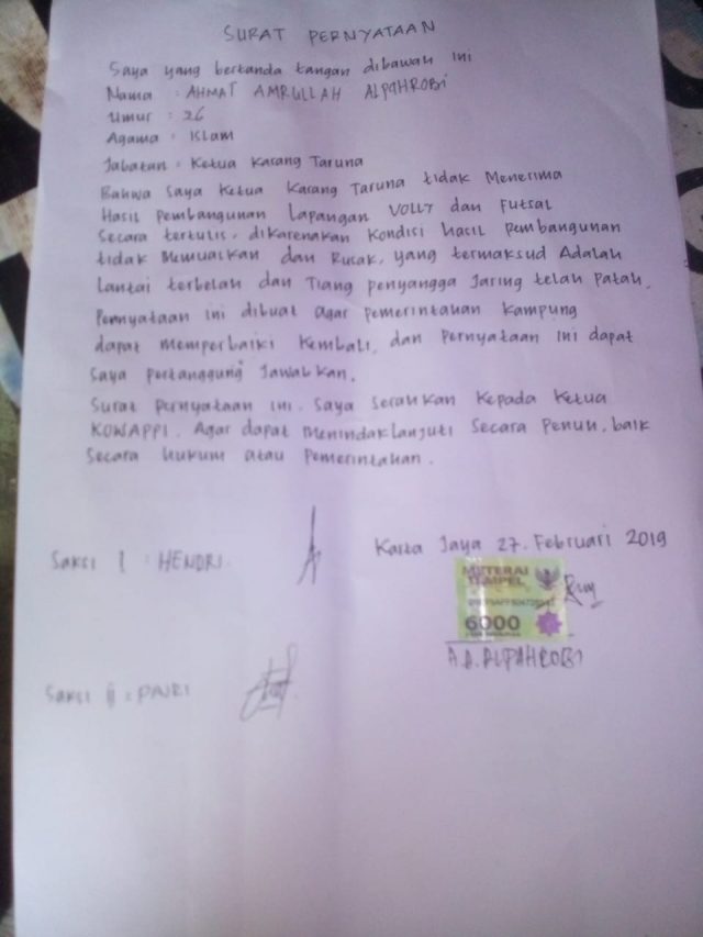 Rahmat mengatakan, pihaknya menerima surat masuk atas penyerahan berkas pernyataan dari pemuda, karang taruna dan TPK kampung Karta Jaya, yang tidak menerima hasil pembangunan lapangan volly dan futsal. serta TPK yang membenarkan bahwa gaji tidak sepenuhnya dibayarkan mantan Kakam Hendriansyah yang sudah di PAW.