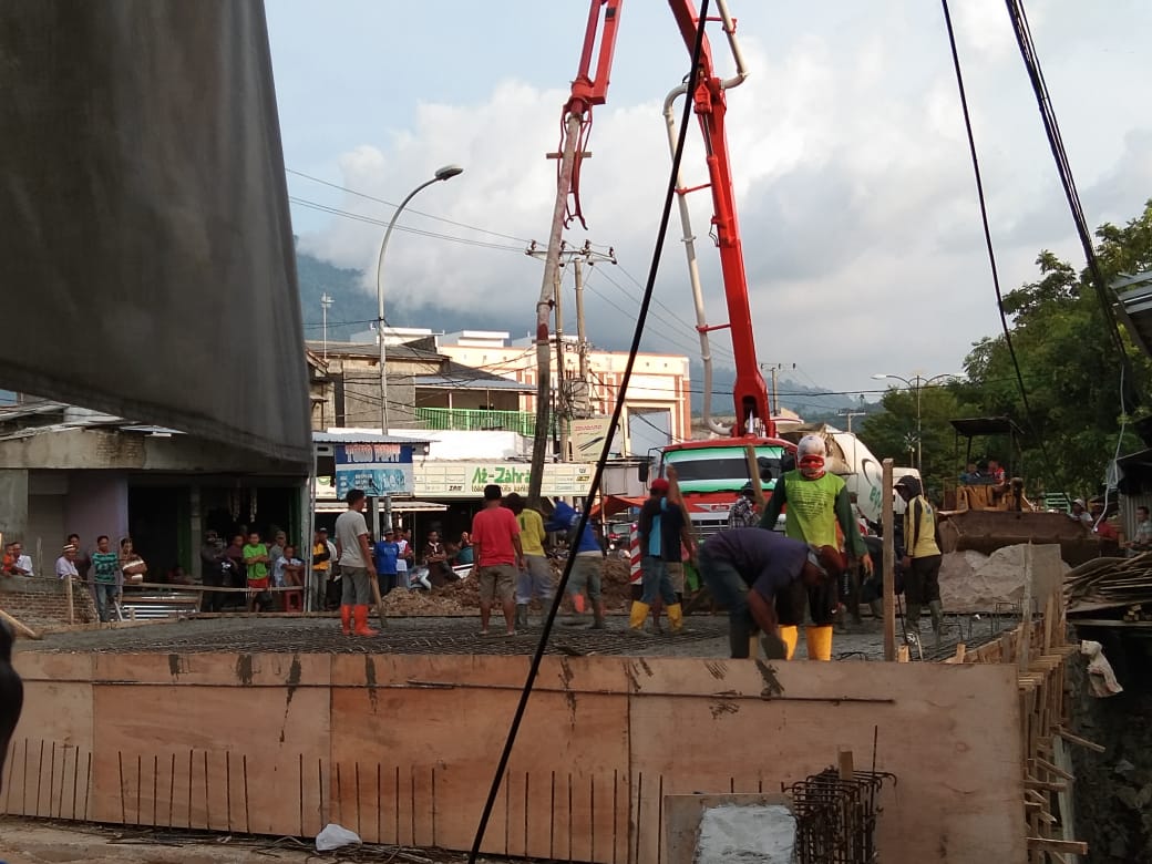 RAKYATNEWS.CO.ID,KALIANDA –-Meski molor tak sesuai dengan waktu yang telah dijanjikan, akhirnya pembangunan jembatan patriot pasar impres Kalianda telah memasuki tahap pengecoran.