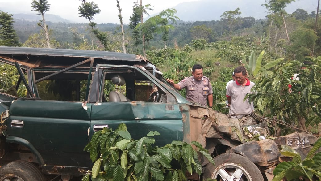 Kecelakaan terjadi sekitar pukul 08.00 Wib, mengakibatkan kendaraan masuk jurang sekitar 30 meter lebih di TKP yang biasa dikenal tanjakan Abri tersebut.