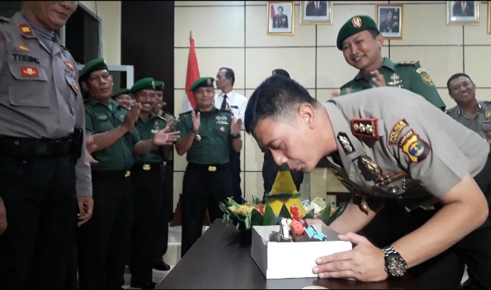 Dengan membawa kue ulang tahun dan tumpeng, Kasdim Mayor Inf. Suhada Erwin memberikan kejutan dan dengan sumringah memberikan ucapan selamat dan meminta Kapolres meniup lilin serta memotong kue.