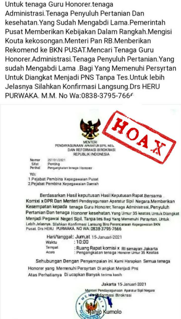 Surat palsu yang bernomor 257/01/2021 tersebut memuat informasi menyesatkan bahwa seolah-olah Menteri PANRB mengangkat tenaga guru honorer, tenaga administrasi, penyuluh pertanian, dan tenaga honorer kesehatan berusia 35 tahun ke atas menjadi Pegawai Negeri Sipil (PNS) tanpa melalui tahapan tes. Selain itu, dalam surat palsu tersebut, juga dicantumkan bahwa pengangkatan tenaga honorer umur 35 tahun ke atas dilakukan pada Jumat, 15 Januari 2021 pukul 10.00 bertempat di Ruang Rapat Komisi X RI Senayan Jakarta.