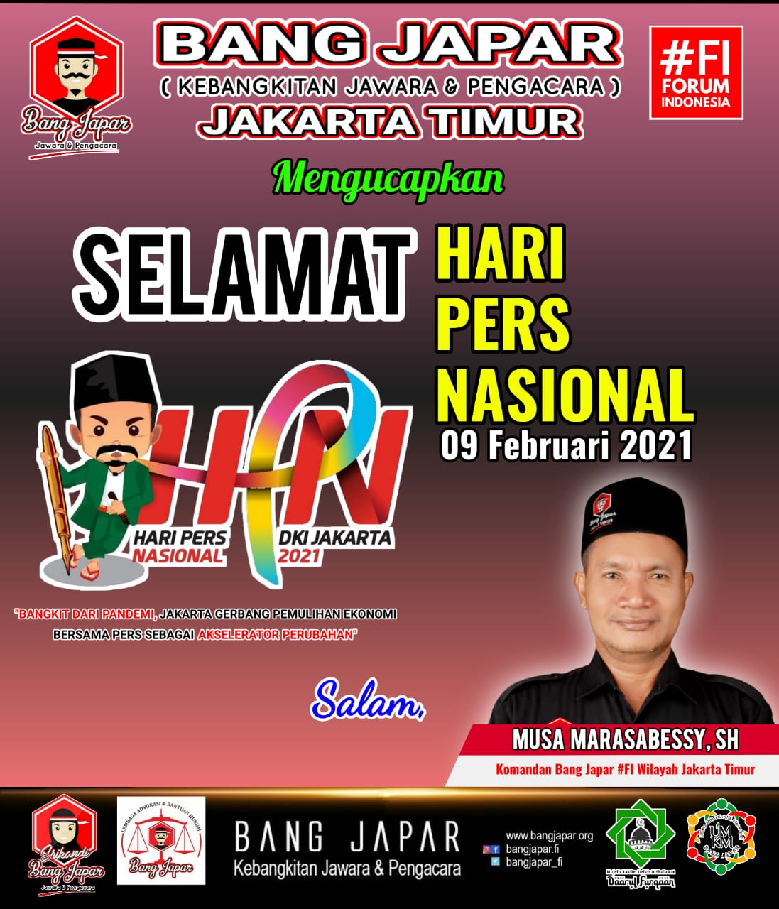 “Keluarga Besar Bang Japar Jakarta Timur mengucapkan selamat Hari Pers Nasional 2021,” kata Komandan Bang Japar Jakarta Timur Musa Marasabessy SH, Selasa (9/2/2021).