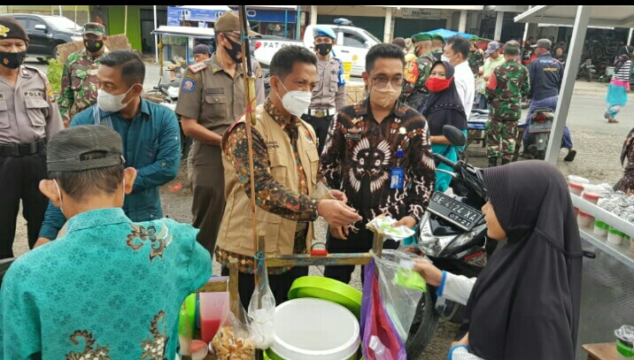 Pesisir Barat – Jajaran Tim Satgas Covid 19 yang terdiri dari, Ketua sekaligus Pj Bupati, Bambang sumbogo, didampingi Staf Ahli Bupati, jajaran Koramil dan jajaran Polsek Pesisir Tengah Serta Pol PP melakukan sidak masker para pedagang takjil di sekitaran Pasar Krui Menjelang berbuka puasa, Pada Kamis (22/04/2021)