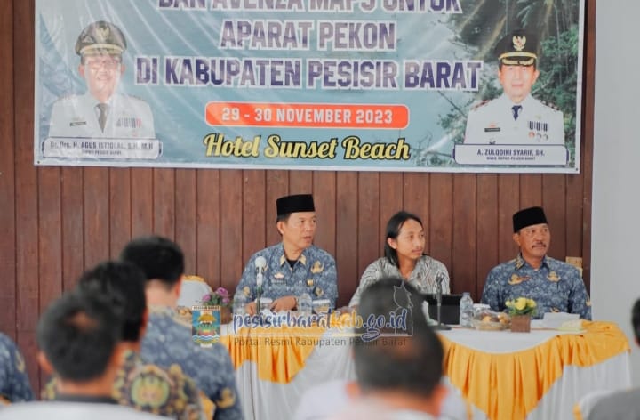 PESISIR BARAT – Asisten I Bidang Pemerintahan dan Kesejahteraan Rakyat, Pemkab Pesisir Narat, Audi Marpi, Menghadiri Sekaligus Membuka Kegiatan Bimbingan Teknis (Bimtek) Penggunaan Aplikasi Batas Desa dan Avenza Maps untuk aparat pekon, di Aula Hotel Sunset Beach, Rabu (29/11/2023).