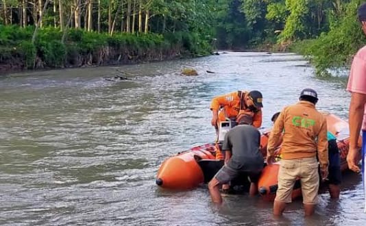 Team basarnas bersama Ratusan warga Tiyuh Wonokerto, Kecamatan Tulang Bawang Tengah, Kabupaten Tulang Bawang Barat, melakukan pencairan terhadap korban yang hanyut terbawa arus sungai.